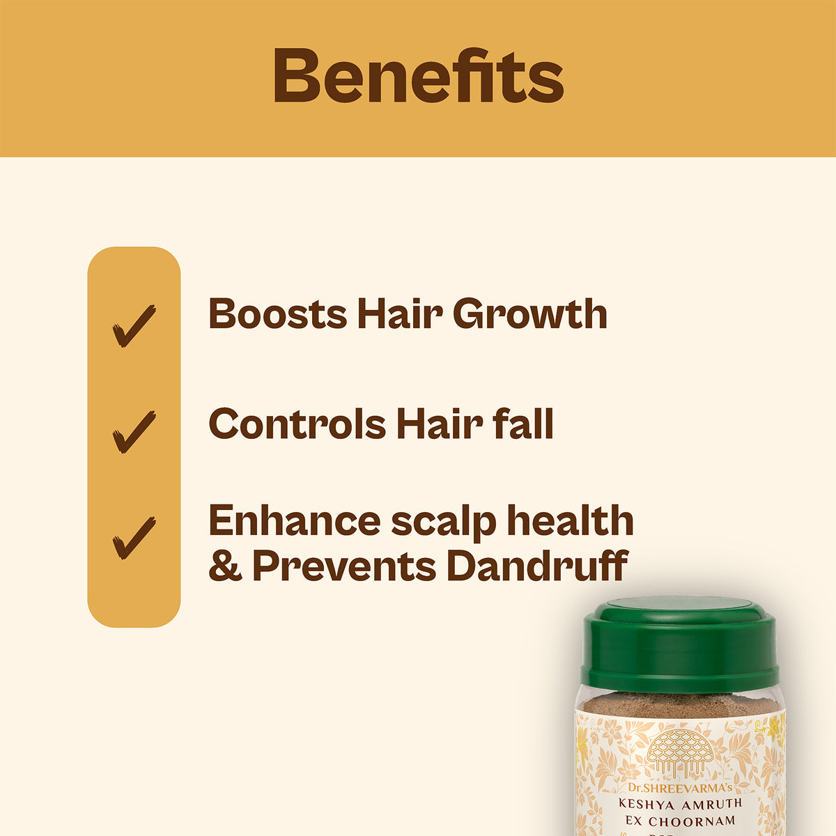 Keshya Amruth Choornam is an Ayurvedic hair care powder used to prevent hair fall, reduce dandruff, and promote healthy hair growth from within.