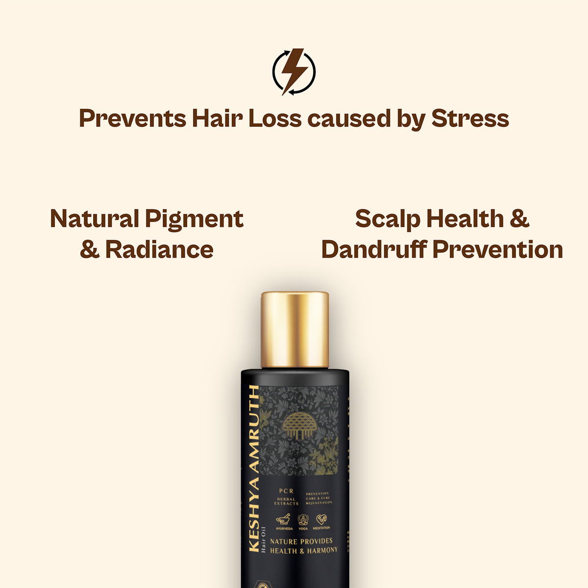 KESHYA AMRUTHA HAIR OIL is a nourishing Ayurvedic oil designed to promote healthier, stronger hair. It works to support hair growth, reduce hair loss, and help pNili, Kethaki Kanda, Coconut Milk, Kamala Moola, Bhringaraja, Sahachara, Arjuna Pushpa, Tagara, Loha Bhasma, Priyangu, Dadima, Guduchi, Triphala, Licorice, Jatamansi, Ashwagandha, White Sandalwood, and Kumuda—infused in Coconut Oil—this Ayurvedic blend nourishes the scalp, supports hair growth, strengthens strands, and maintains natural color.